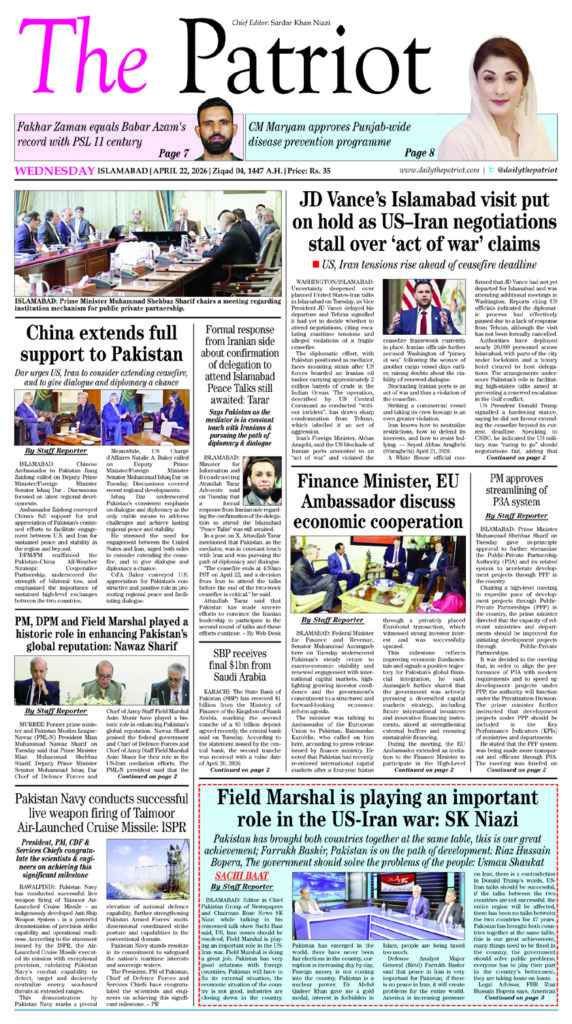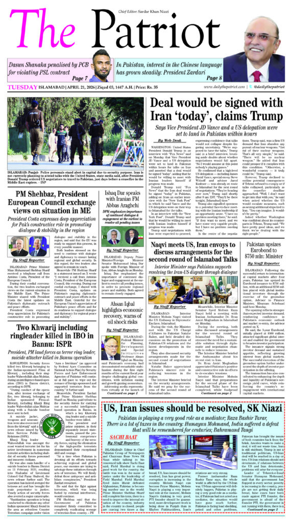Pakistan is playing a very good role as a mediator; Raza Bashir Tarar, There is a lot of taxes in the country: Humayun Mohmand, India suffered a defeat that will be remembered for centuries; Bahramand Tangi By Staff Reporter ISLAMABAD: Editor in Chief Pakistan Group of Newspapers and Chairman Roze News SK Niazi while talking in […]