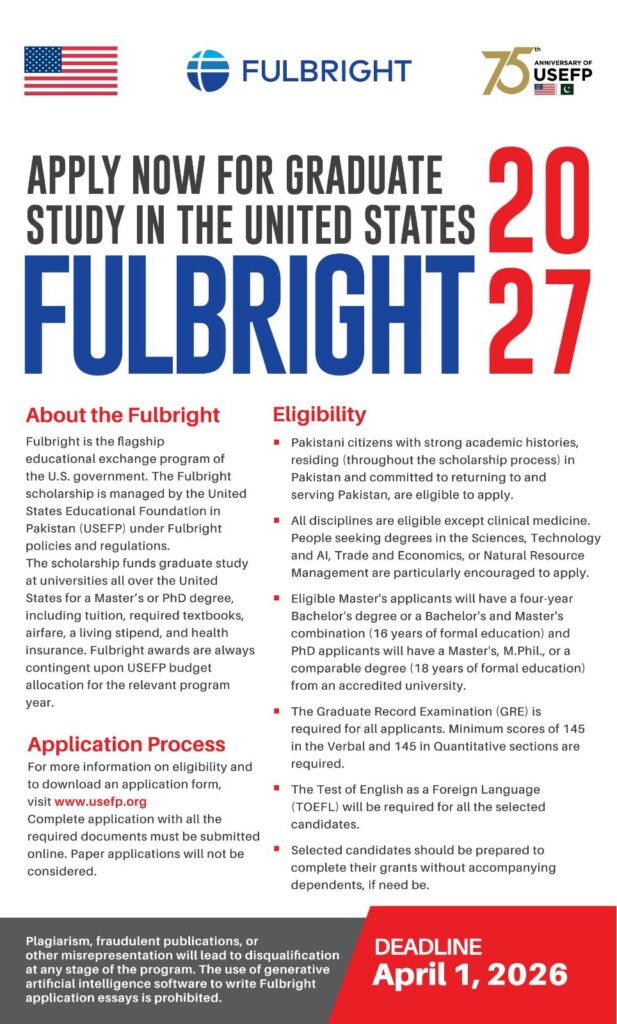 Islamabad, : The United States Educational Foundation in Pakistan (USEFP) is pleased to announce the opening of applications for the prestigious 2027 Fulbright Student Program. Funded by the United States government in partnership with the Government of Pakistan, the highly competitive merit-based scholarship supports graduate study at leading U.S. universities, including tuition, living expenses, insurance, and air travel. The program defines merit broadly, considering not only grades and test scores but also applicants’ leadership potential and commitment to contributing to Pakistan’s future in a manner that supports U.S. policy goals.
